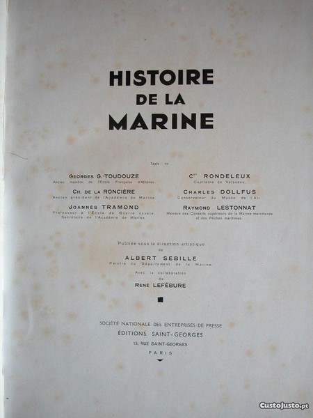 N 8761 Histoire de la Marine. G. Toudouze, Georges / Ronciere, Ch. de la / Tramond, Joannes / Cdt. Rondeleux / (sous la direction artistique de Albert Sebille). Dimensões: 38,5x29cm. Edité par P., Administration Provisoire dImprimerie [Editions Saint-Georges], s.d. (1934). (1934). P., Administration Provisoire dImprimerie [Editions Saint-Georges], s.d. (1934)., 1934. Couverture rigide. État : Bon. In-folio, demi-toile rouge moderne, pièce de titre, XI-605 pp., texte sur 2 colonnes, très nbr. ill. en noir et en couleurs in et h.-t., certaines planches en couleurs contrecollées sur papier fort teinté. Index. Bel ex. De la collection des grands albums publiés par "L'Illustration".