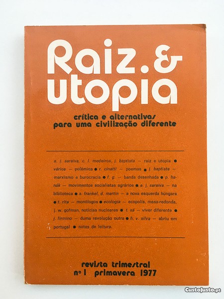 A. I Saraiva, C. I. Medeiros, 1. Baptista Raiz e Utopia Vários - Polémica Or. Cinatti - Poemas. J. Baptista - Marxismo e Burocracia e F G Banda Desenhada e P. Hanák - Movimentos Socialistas Agrários o A.). Saraiva - na Biblioteca e S. Frankel, D. Martina Nova Esquerda Húngara .T. Rita - Monólogos e Ecologia - Ecopolis, Mesa-Redonda, W. Gofman, Notícias Nucleares Sá - Viver Diferente e Firmino - duma Revolução Outra Eh. V. Silva - Abriu em Portugal