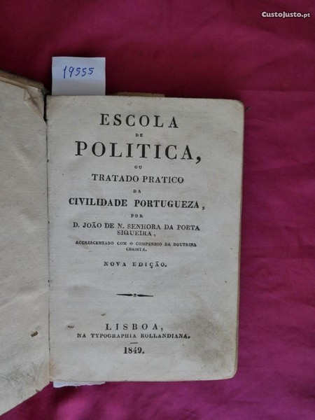 N 19555 Escola de Política ou Tratado de civilidade Portugueza. Por D. João de N. Senhora da Porta Siqueira, acrescentado com um o compêndio da doutrina Christã. Nova Edição. Na Typographia Rollandiana 1849. 264 Pgs. Encadernado em inteira de pele com defeitos na capa D. João de N. Senhora da Porta Siqueira foi cónego regrante da Ordem de Santo Agostinho. No final da sua vida dedicou-se a publicar várias obras /traduções na maior parte) e ao ensino consolidados. 16x21cm.