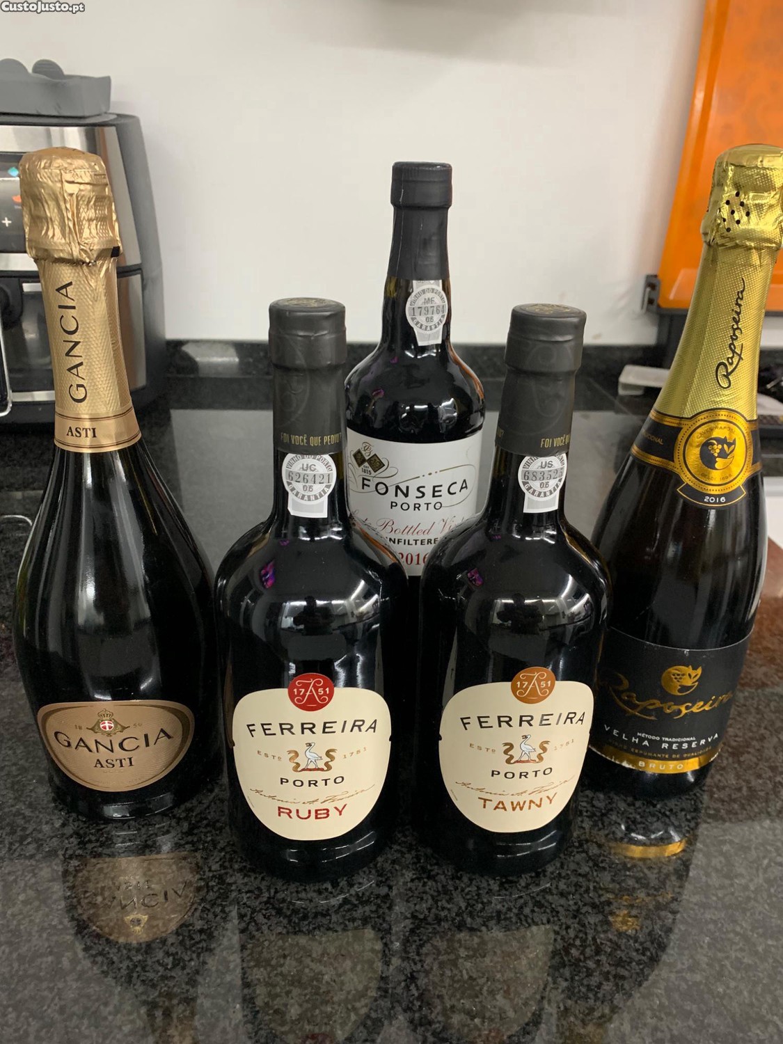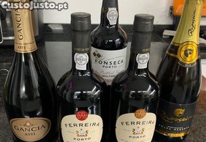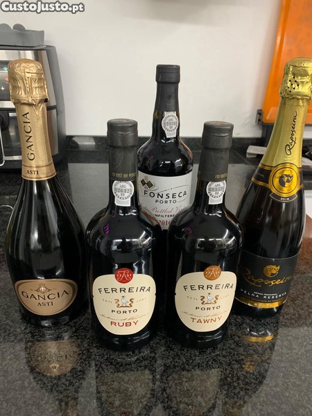 Vendo estas 5 garrafas. 3 de vinho do Porto e 2 de espumante.