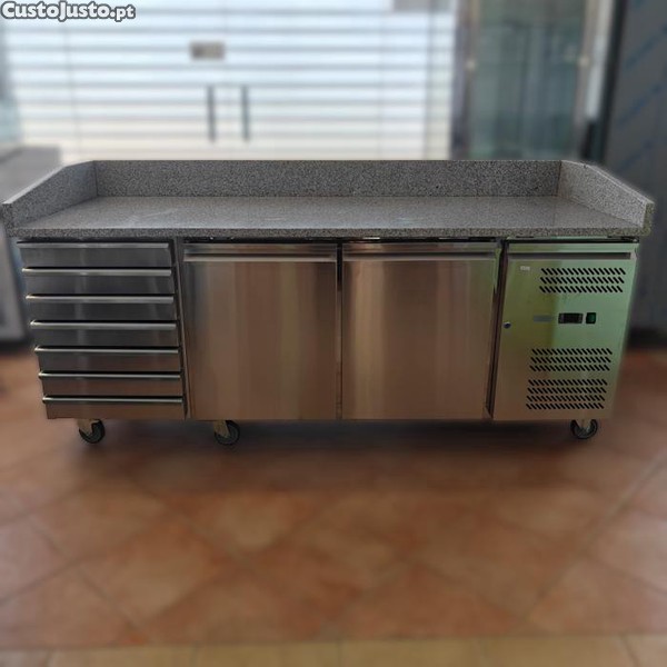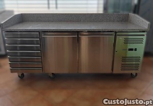 N432- Bancada refrigerada de pizzaria, com 2 portas refrigeradas e 7 gavetas neutras. Grupo incorporado, tampo em granito, com rodas.