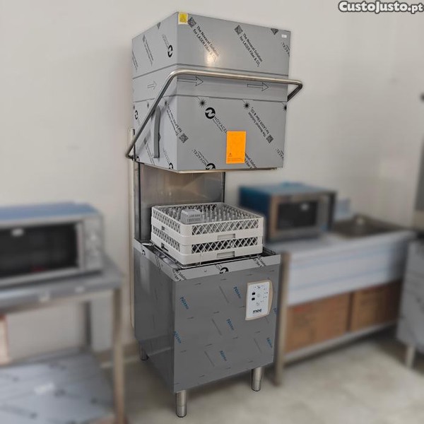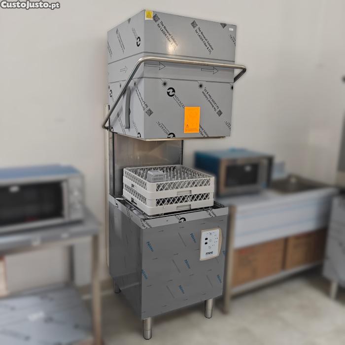 N806- Máquina de lavar louça de capota TE100, com controlo eletrónico e cesto 50×50. Ciclo de 90 120 segundos. Inclui: bomba doseadora peristáltica e temporizada de abrilhantador; 3 cestos (prato, talheres e liso).