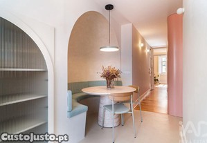 Este apartamento de 90 m² conjuga o charme de um edifício histórico de 1930 com uma reabilitação contemporânea assinada pelo Estúdio Cabo (concluída em Outubro 2025). Localizado no 3.º andar (sem elevador), o imóvel beneficia de uma excelente exposição solar, garantindo luminosidade natural durante todo o dia.