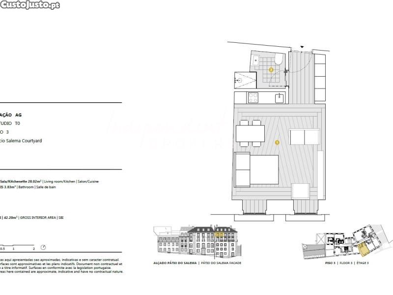 - O empreendimento dispõe de um apartamento T0 com teto trabalhado