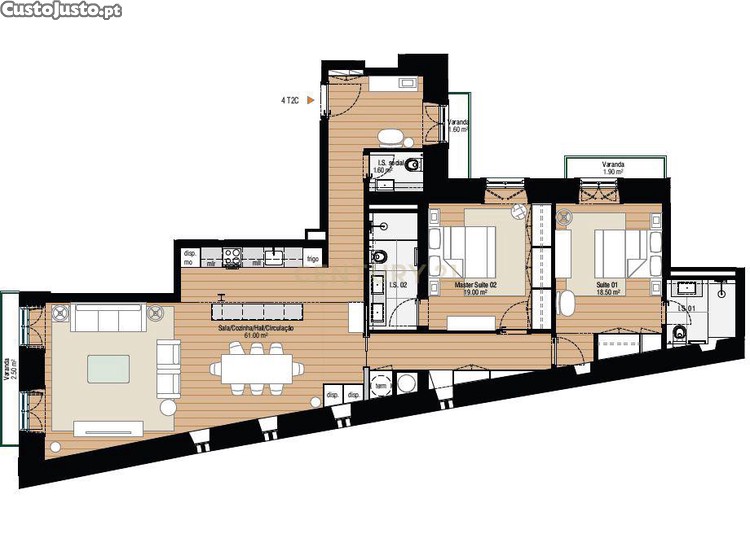 Sofisticado T2 com varanda e amplas áreas interiores.