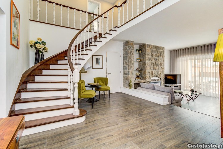 No piso térreo, o hall de entrada dá as boas-vindas a uma espaçosa sala de estar com lareira, perfeito para momentos de convívio em família. A sala de jantar acolhedora e o escritório oferecem espaços distintos para cada necessidade do dia a dia. A cozinha, totalmente equipada e funcional, é ideal para os amantes da culinária, contando ainda com uma prática zona de lavandaria e acesso direto ao agradável espaço exterior.