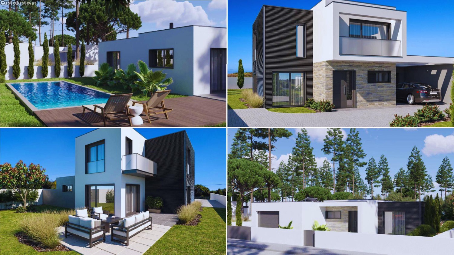 Moradia térrea T2, destinada a clientes com terreno próprio. Dispõe de cozinha equipada, garagem fechada para um carro, ar condicionado, bomba de calor e acabamentos contemporâneos.
