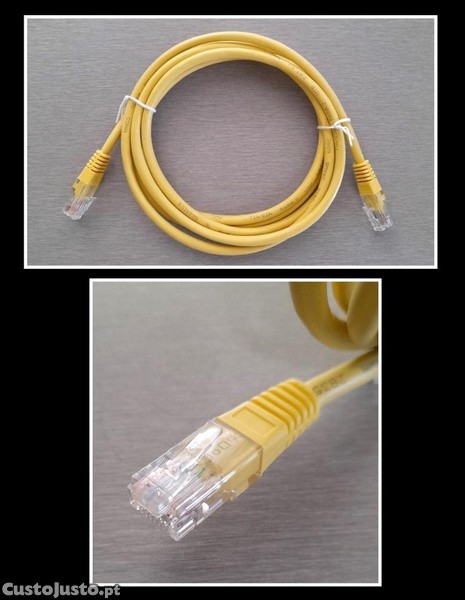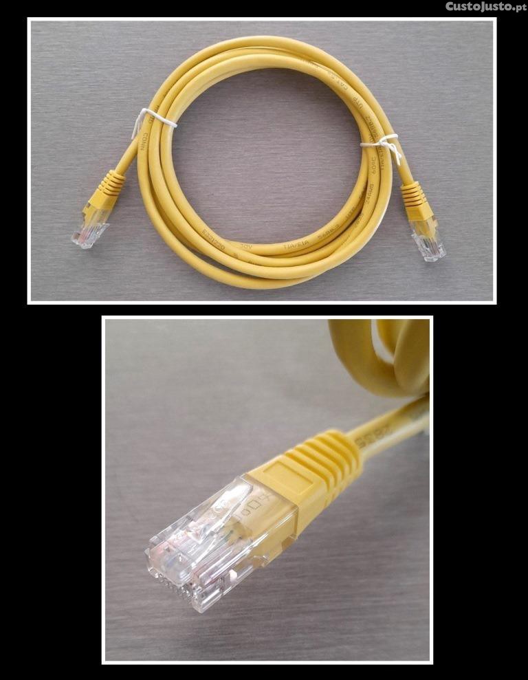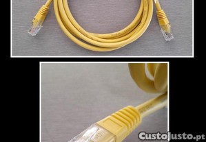 Cabo Ethernet, novo, em amarelo, categoria 5e, com conectores RJ45 Macho/Macho, comprimento de 2MT, excelente estado.