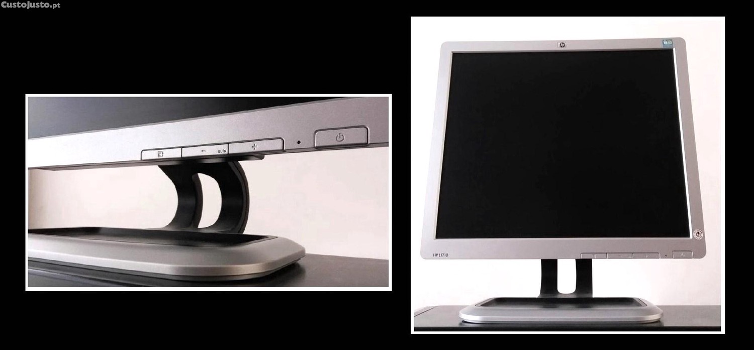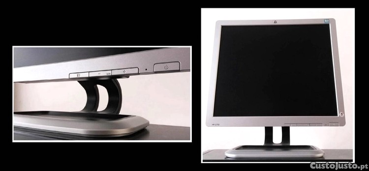 Monitor 'HP', com 17 polegadas, controlos frontais, com cabo de alimentação e VGA, em pleno funcionamento, excelente estado.