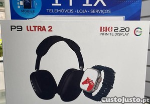 Pack com auscultadores P9 Ultra 2 e smartwatch, ideal para o dia a dia.