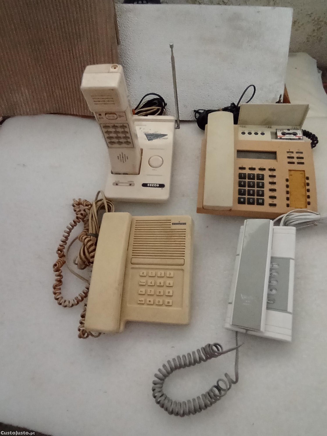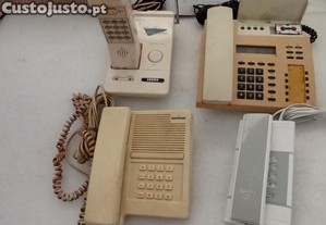 Telefones antigos, fixos e móveis. Estavam a funcionar quando saíram de serviços, mas poderão alguns já não funcionar.
