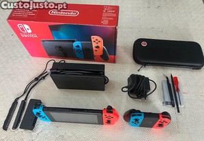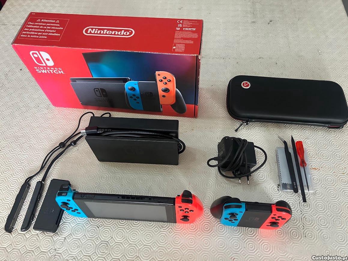 Nintendo Switch1 completa com comandos extra e caixa de transporte. Acompanha todos os acessórios necessários para jogar em qualquer lugar com conforto e comodidade. Pelicula protetora nova anti reflexo. Junto Kit de reparação das guias dos comandos ( 2 do lado esquerdo novas ).