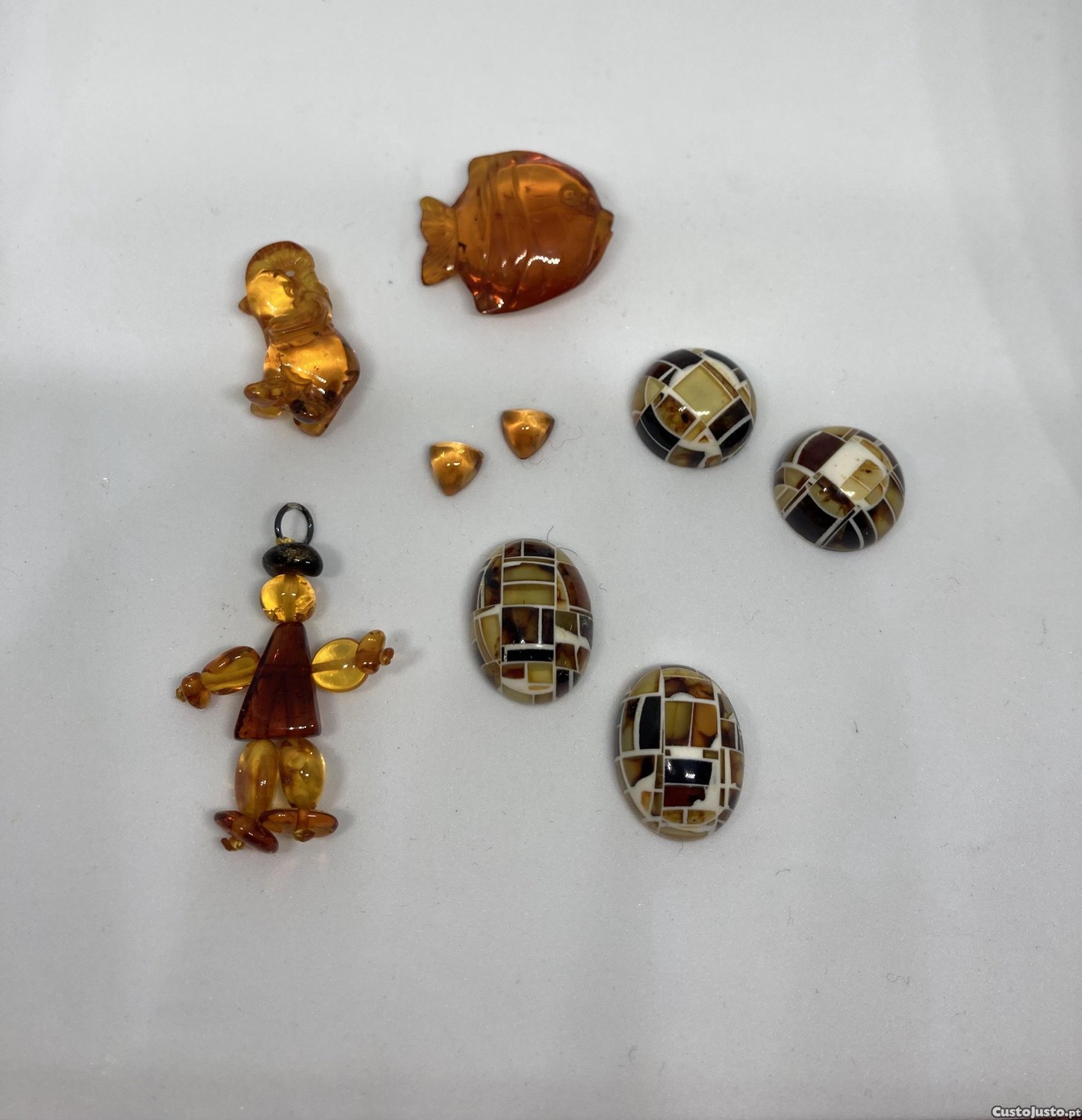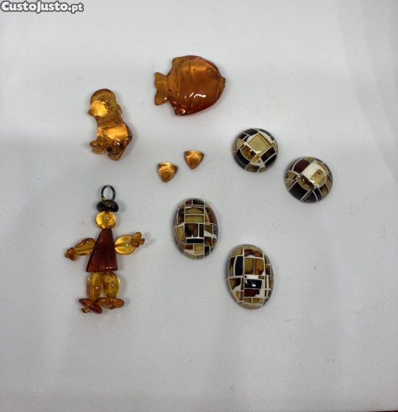 Âmbar em diversas formas e par de citrinos em triângulo