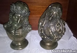 Duas estatuetas religiosas de Nossa Senhora e Jesus Cristo.