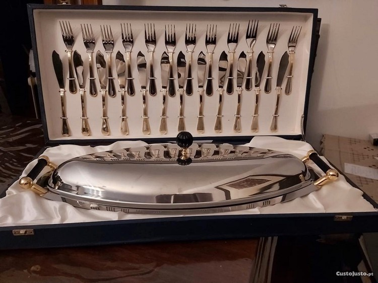 Travessa para Peixe com Tampa, 12 facas e 12 garfos e com aplicação a ouro 24 k.