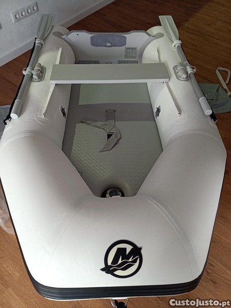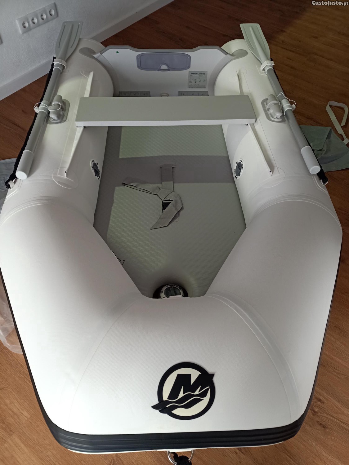 Barco pneumático novo com 2,40 metros, lotação para 3 pessoas, peso 18,8 quilos, potência máxima motor 4hp. Disponível para entrega imediata.