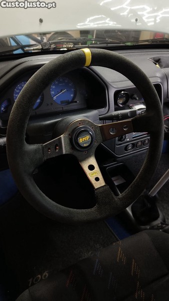 Vendo volante OMP Racing com cubo e buzina para Peugeot 106 ou Citroen Saxo. Em excelente estado de conservação. O volante ainda se encontra no carro, pelo que não está disponível para entrega imediata. O comprador poderá reservá-lo mediante o pagamento de um valor simbólico correspondente a 10%, liquidando o remanescente no acto da entrega.