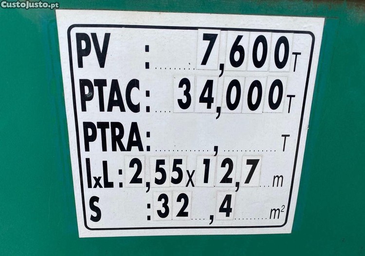 - Peso Bruto Total Combinado (PBT): 34.000 kg; Peso Bruto Total Combinado (PBC): 38.000 kg