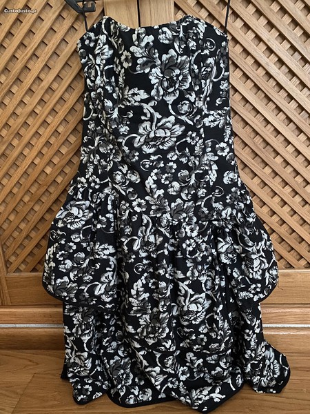 Preto e branco, modelo cai-cai todo forrado no interior. Na parte da saia, tem camadas sobrepostas. Fecha atrás com fecho.