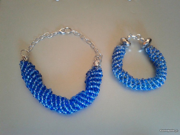 Vendo conjunto de pulseira e Colar em missangas em tons de azul realizado com a técnica de espiral russa.