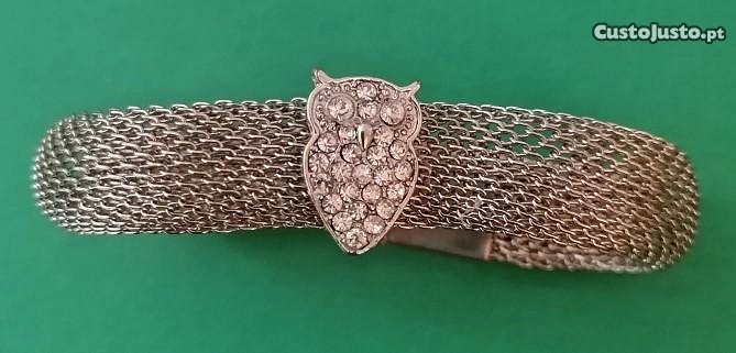 Pulseira em malha inglesa em metal prateado e fecho magnético, com figura de mocho e 25 marcassitas.