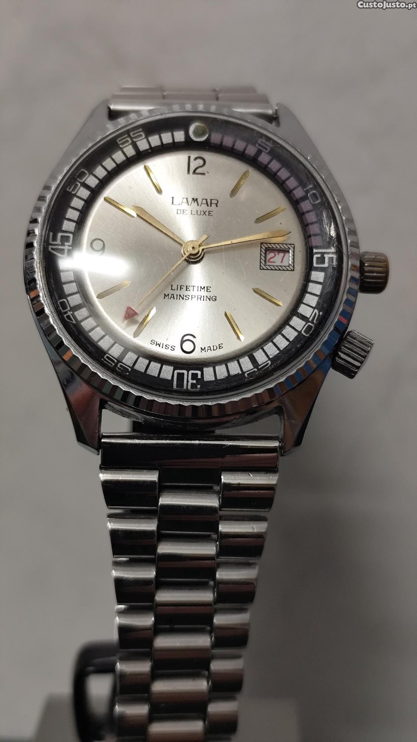 Relógio antigo Lamar de corda manual, vidro sem riscos, o mostrador em bom estado e a caixa está em bom estado de conservação e mede 42mm de diâmetro sem contar a coroa.