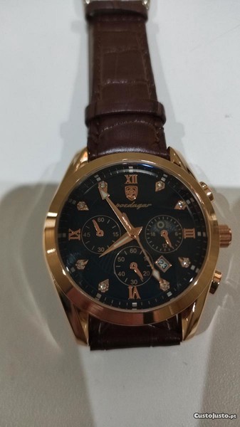 Relógio Poedagar em Aço Inoxidável, resistente à água e com pulseira em pele genuína.