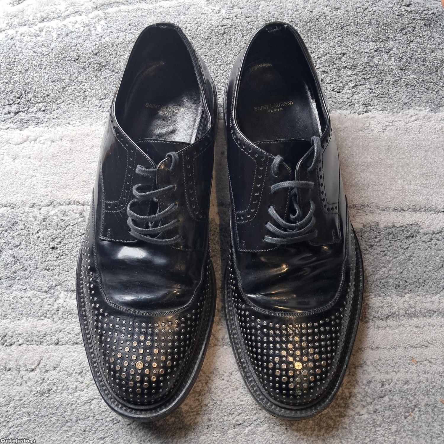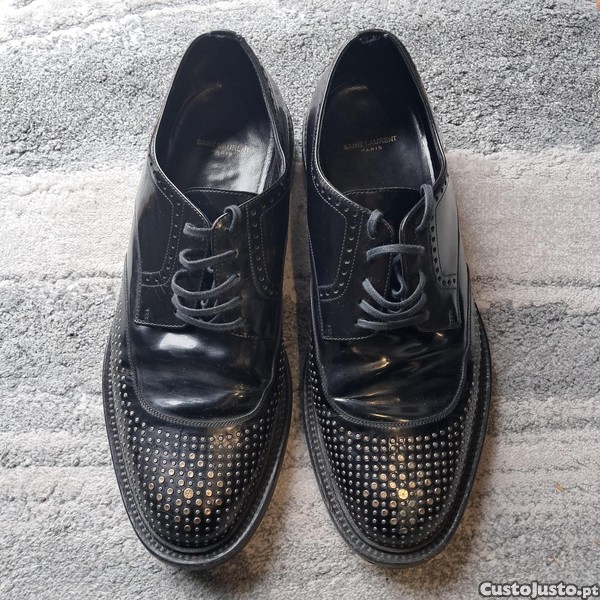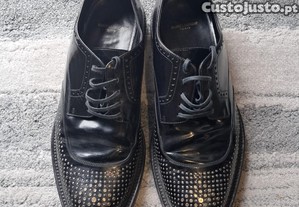 Vendo sapatos Saint Laurent SL originais, em pele preta escovada, com atacadores e detalhe de tachas, um modelo marcante que combina elegância, atitude e acabamento de luxo característico da marca.