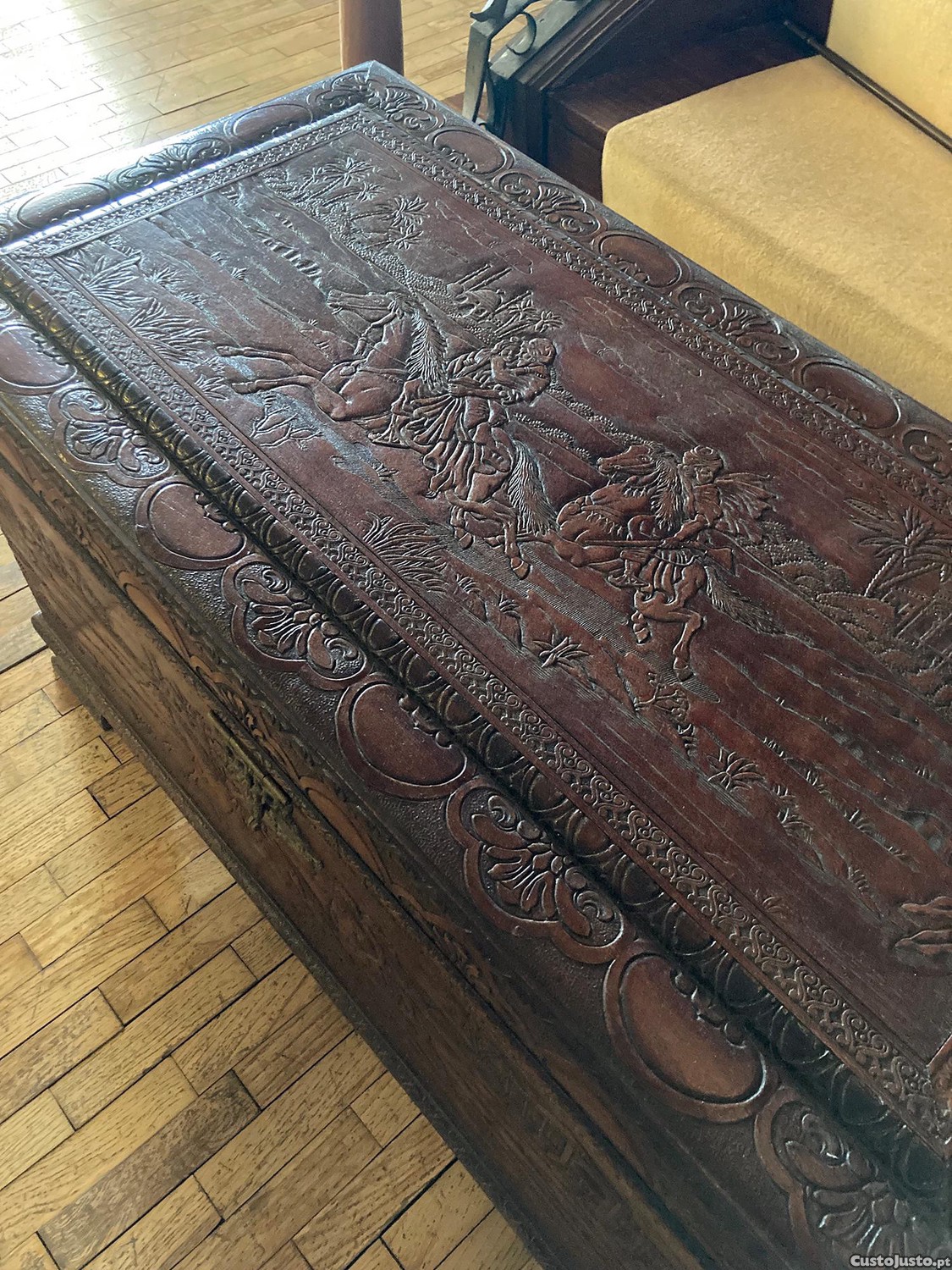 - Exterior ricamente esculpido com cenas detalhadas (figuras a cavalo e paisagens orientais) no tampo, na frente e nas laterais.
