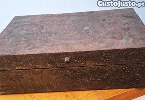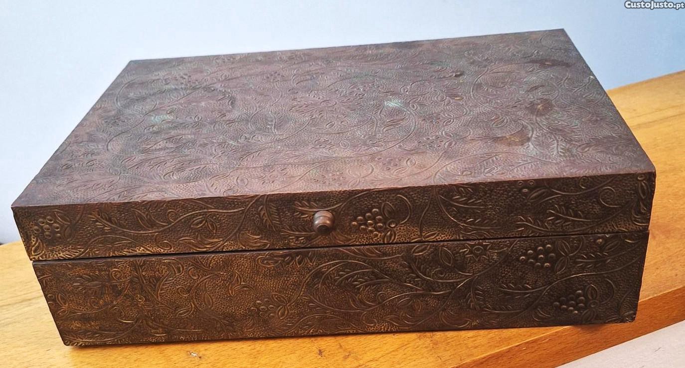 Caixa vintage retangular em madeira, com fecho, forrada a papel de latão, com decoração relevada floral.