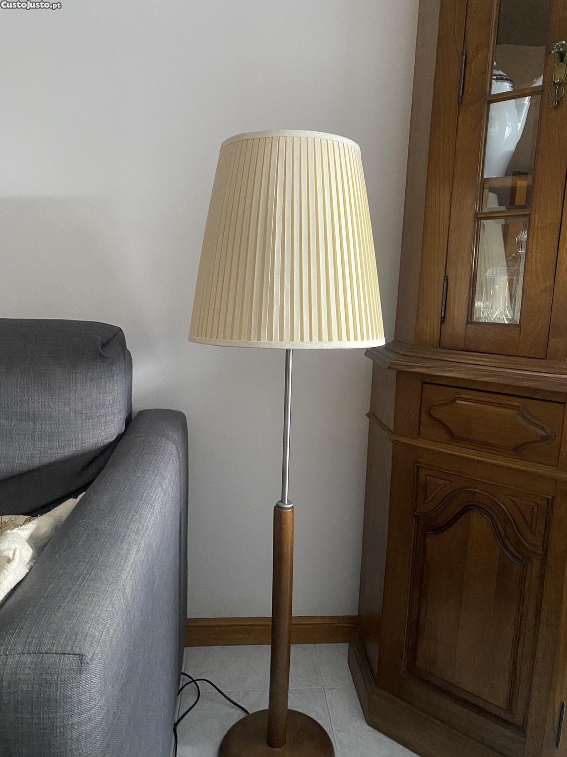 Candeeiro de pé elegante com base em madeira e abajur plissado bege. Em bom estado e totalmente funcional.