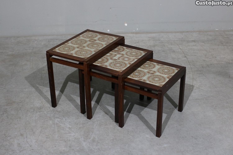 Preço: 800 €Conjunto de 3 mesinhas dinamarquesas em pau santo e azulejo