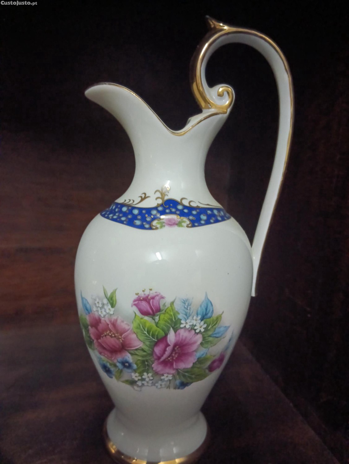branco e tons azuis , motivos florais, com frisos dourados.
