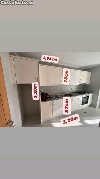 - Armários brancos: módulos superiores (3,96 m) e inferiores (3,20 m) medidas nas fotos