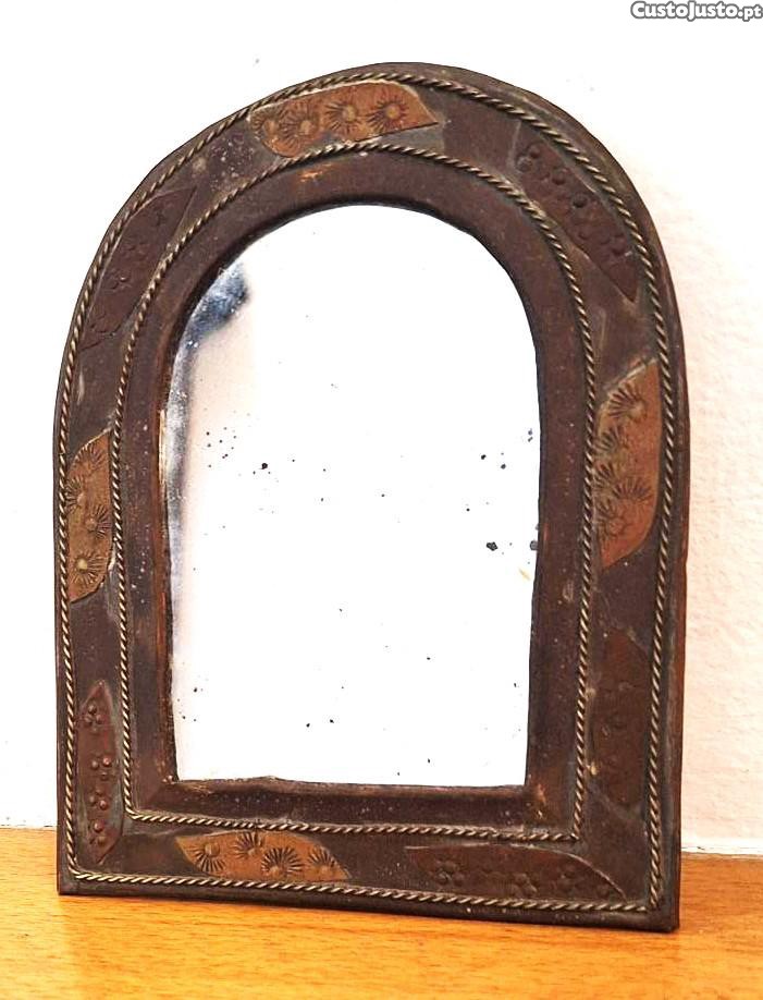 Espelho decorativo antigo com moldura em metal e pequenos recortes decorados em cobre, com a altura de 13,5cm e a largura de 10,5cm.