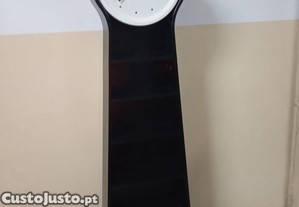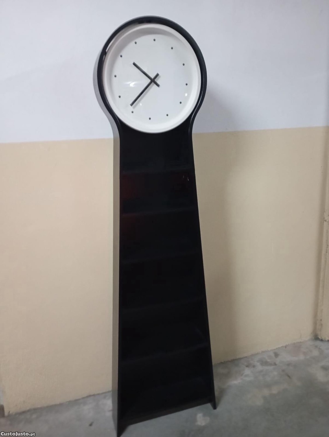 Estante preta com prateleiras e relógio incorporado.