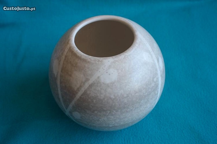 Jarra decorativa bege. Tem 15 cm de diâmetro.
