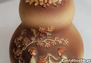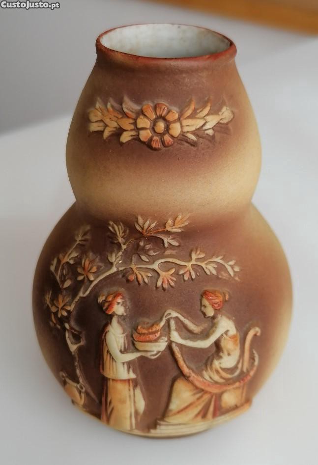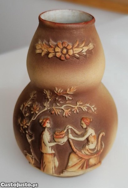 Jarra em biscuit europeu (França?), formato de cabaça, com cena clássica grega relevada, cor castanha, com figuras mitológicas e flores em relevo.