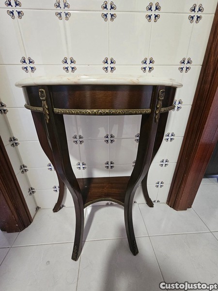 Mesa de apoio em madeira escura com detalhes decorativos e tampo em mármore.