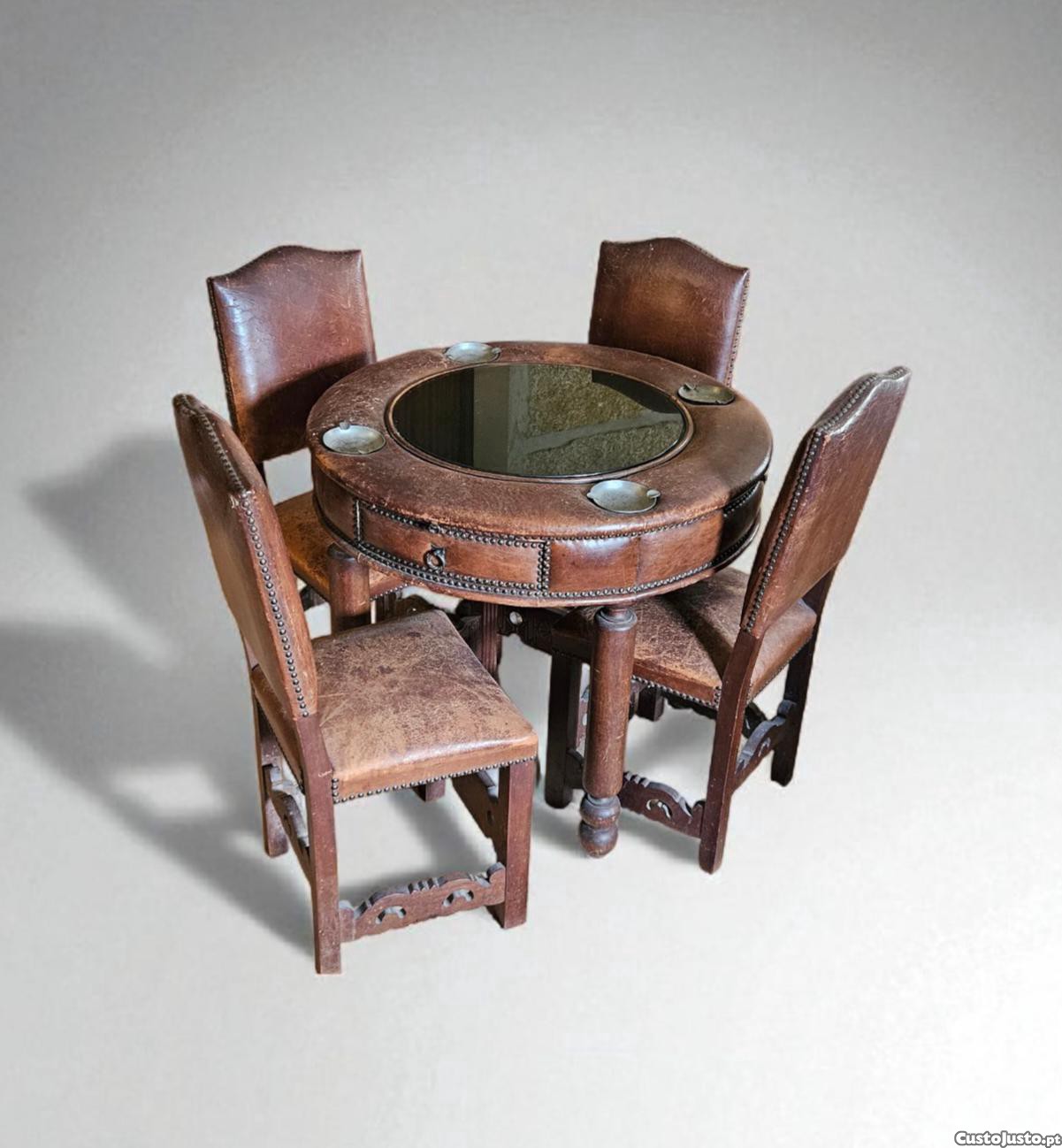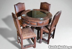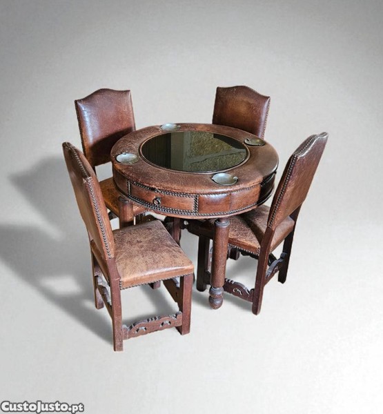 Mesa redonda de jogo com tampo em vidro e estrutura revestida a pele, acompanhada de 4 cadeiras em madeira com estofo em pele conjunto muito original e distinto.