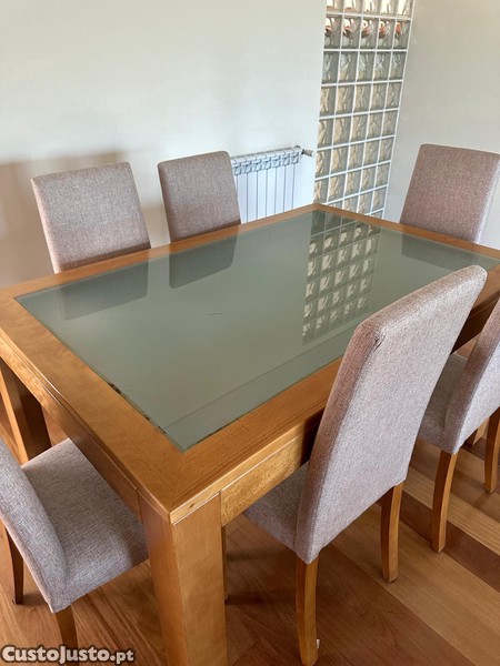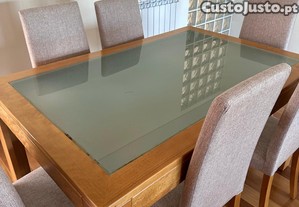 Mesa de jantar de madeira com tampo de vidro, em bom estado de conservação. Ideal para a sua sala de jantar.
