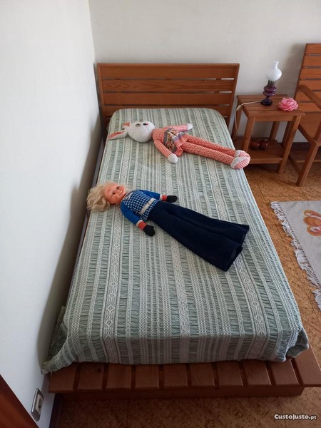 Mobília de quarto de solteiro em pinho composta por: - Cama (catre), com colchão e mesinha de cabeceira; - Guarda fatos composto por duas partes separáveis e três portas medidas: altura total - 2,57 cm altura da parte maior - 1,84cm largura - 1,56 cm - Móvel de prateleiras em ângulo reto cujos lados medem 1,24 cm e 1,08 cm; fundo das prateleiras 25cm; tem mesa incorporada e quatro gavetinhas - Banco corrido com comprimento 1,20 cm, altura total 85 cm e largura 50 cm..