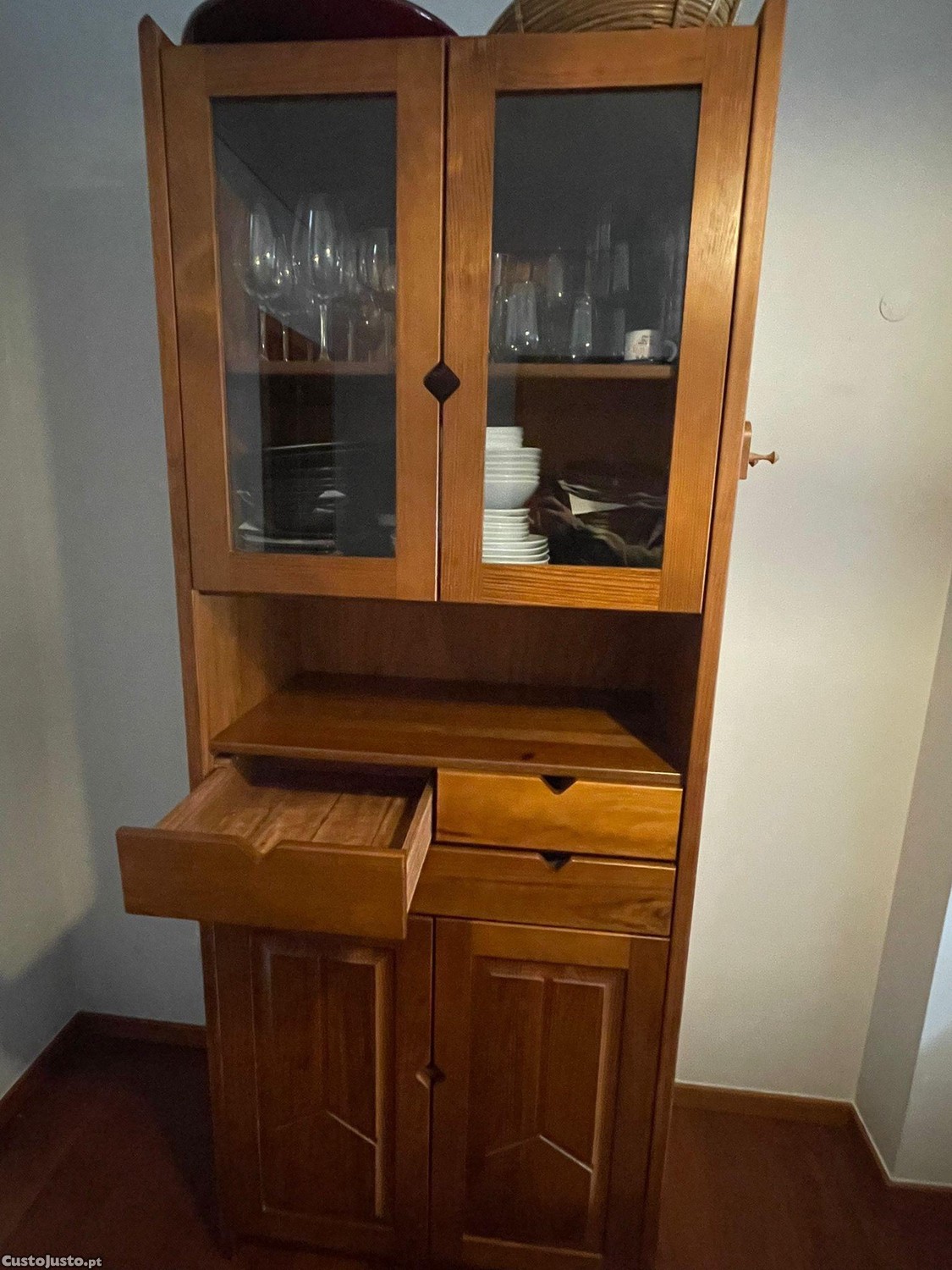 Móvel de madeira usado para sala de jantar, com portas de vidro e gavetas. Ideal para guardar e exibir pratos, copos e outros utensílios de cozinha. Um móvel prático e com ótimo acabamento em madeira, que pode complementar o seu espaço de refeições.