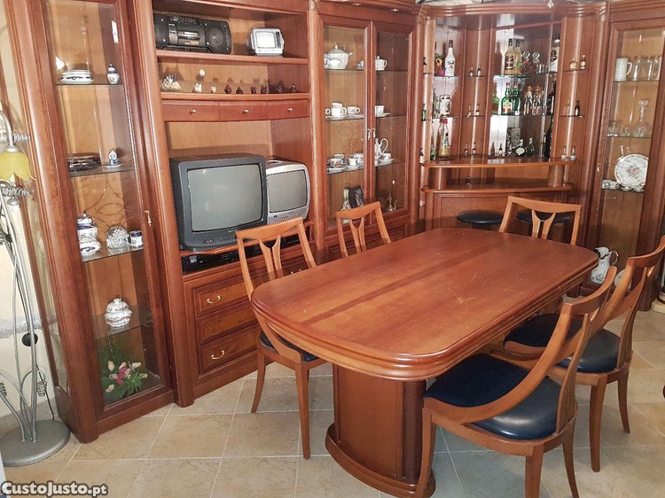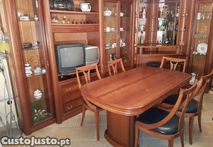 Móvel sala com bar e cristaleiras. Várias gavetas para arrumos. Muito espaçoso. Móvel cerejeira e tampos em raíz de nogueira. Com focos embutidos. Pode ser alterada a ordem dos módulos. Apenas o vidro de uma porta de uma cristaleira está partido. Mesa extensível onde cabem à vontade 10 pessoas, com 6 cadeiras robustas em pele. Dois bancos altos também em pele igual. Também tenho sofás com a mesma pele das cadeiras que poderá ser negociado. Pode vir ver sem compromisso e fazer a sua proposta. Tenho também um bilhar snooker na mesma cor do móvel cerejeira.