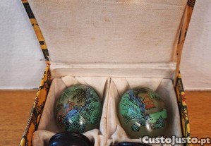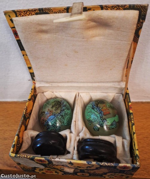 Par de pequenos ovos de jade em suporte de madeira marrom escuro, com pintura manual asiática em estojo próprio.