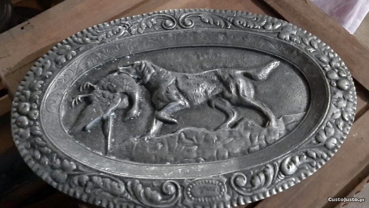 Prato decorativo em estanho com o tema da caça.