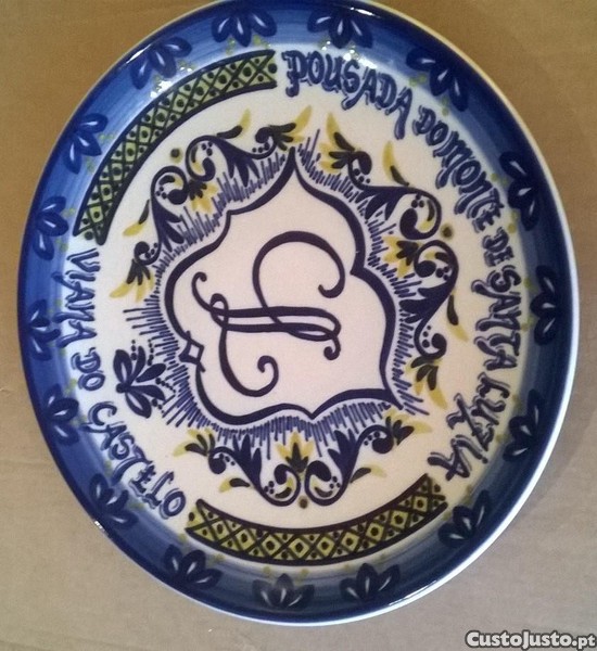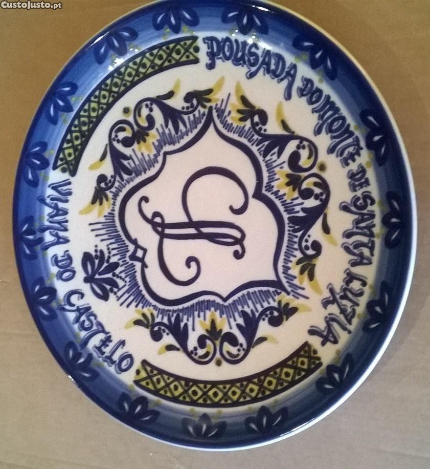 Prato em faiança "Viana Grés", pintado à mão, redondo, policromado, com dizeres: Pousada do Monte de Santa Luzia / Viana do Castelo.