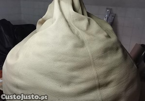 Puff em couro bege com diâmetro de 1 metro, praticamente sem uso e por isso, em bom estado de conservação. Peça versátil que pode ser usada como assento adicional ou decoração na sala de estar.