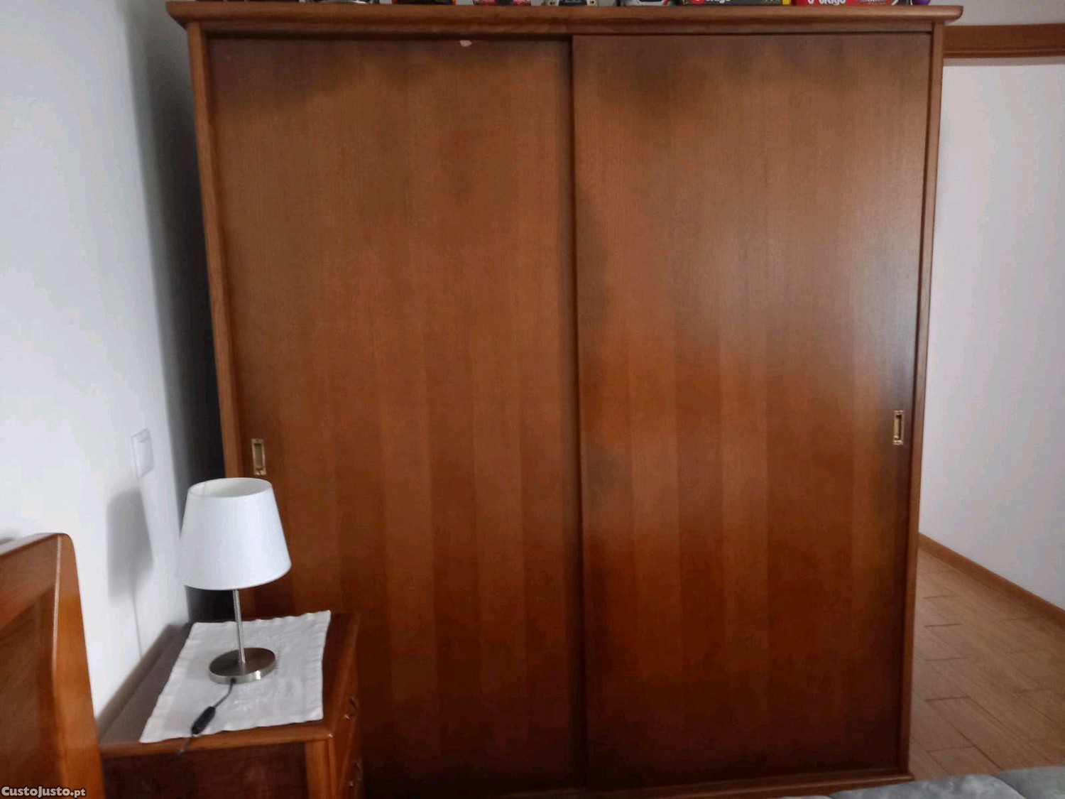 Este roupeiro em madeira é um móvel prático e versátil para o seu quarto. Com portas deslizantes, oferece espaço de arrumação generoso. Apesar de usado, mantém-se em bom estado de conservação e pode ser uma ótima opção para quem procura um móvel funcional e de qualidade a um preço acessível.