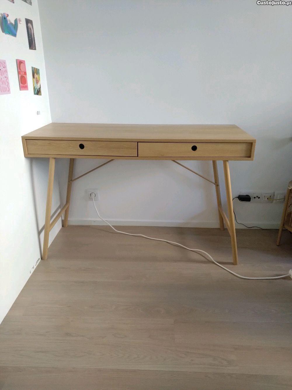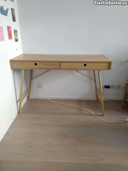 Secretária cor de carvalho natural clara com 2 gavetas e pés de metal a imitar madeira, da mesma cor. Somente com 3 meses e raramente usada! 48x120cm. Da Jysk, secretária Lindved. Cadeira na última foto tambem para venda.